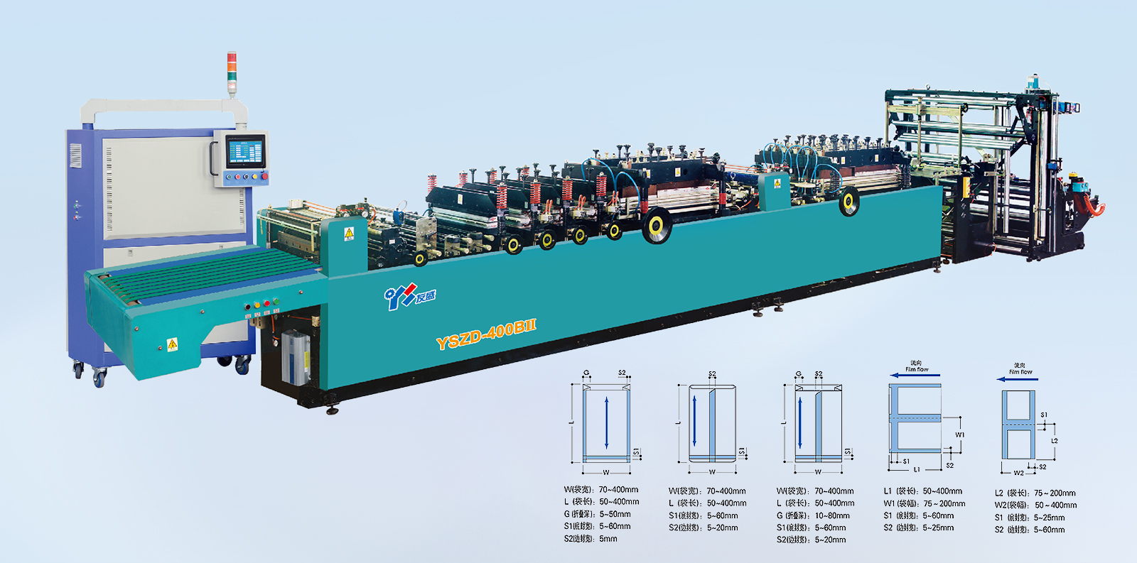 YSZD-400B Ⅱ中封、三邊封、四邊封高速全自動制袋機 YSZD-300/400/500ZF中封、側封、四邊封高速全自動制袋機 YSZD-500ZF中封、側封、四邊封高速全自動制袋機 YSZD-500/600/700/800/1000H三邊封高速全自動制袋機 YSZD-600C無接縫站立袋三邊封、站立袋高速全自動制袋機 YSZD-500HK三邊封、站立袋、拉鏈袋、無接縫站立拉鏈袋、儲料架高速全自動制袋機 YSZD-600HB三邊封、站立袋、拉鏈袋高速全自動制袋機 YSZD-600HK三邊封、站立袋、拉鏈袋、無接縫站立拉鏈袋高速全自動制袋機 YSZD-600HK Ⅰ上下圖案跟蹤三邊封、站立袋、拉鏈袋、無接縫站立拉鏈袋高速全自動制袋機 YSZD-600HK Ⅱ CCD視覺定位裁切三邊封、站立袋、拉鏈袋、無接縫站立拉鏈袋高速全自動制袋機 YSZD-800HK三邊封、站立袋、拉鏈袋、無接縫站立拉鏈袋高速全自動制袋機